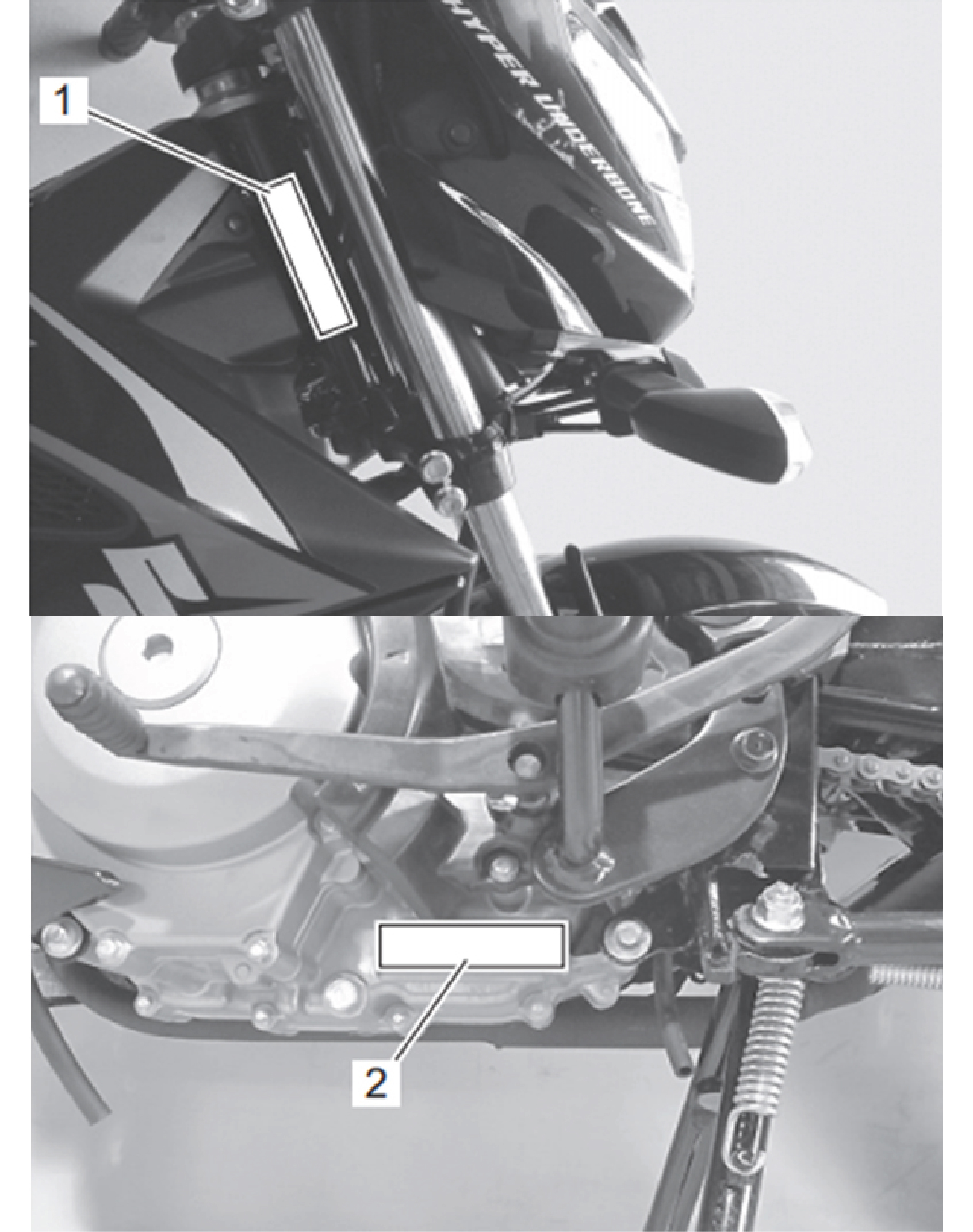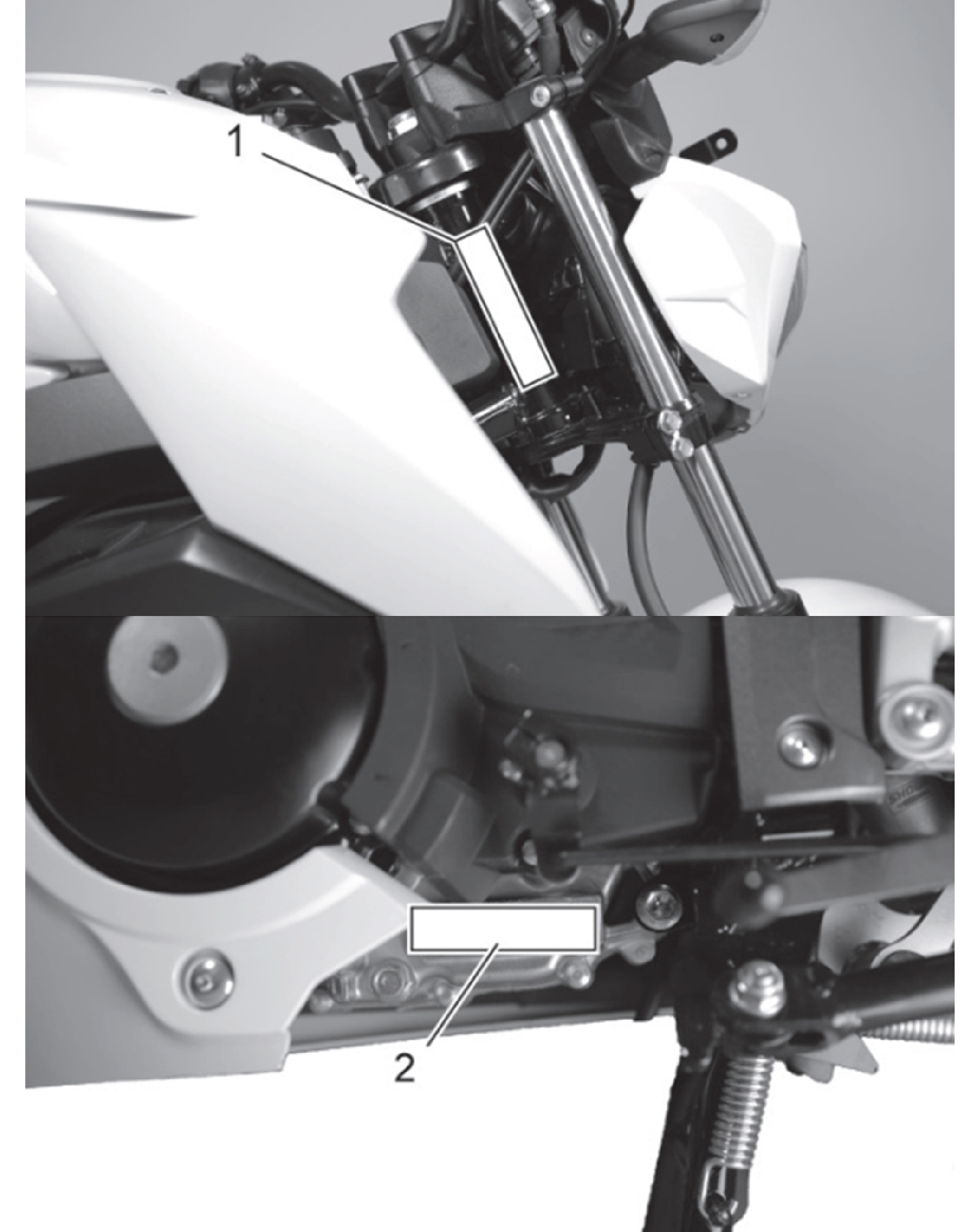 Số khung được dập trên khung sau (1). Số seri động cơ nằm ở bên trái lốc máy (2).